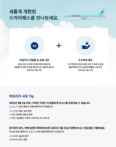 대한항공에서는 올해 2023.04.01 부터 마일리지 제도 즉 공제 내용을 전환 한다는 내용을 알렸는데요. 사전고지 포함 3년 3개월의 유예기간을 거쳐 2023년 4월 1일부터 적용 예정이던 스카이패스 제도 변경을 중단하며, 마일리지 적립, 공제 기준과 우여러번원 제도는 현행 제도를 유지한다고 하더라고요. 기존 제도를 계속 지켜가는 것은 무엇이고 갱신되는 점이 있는지 체크해 볼게요.