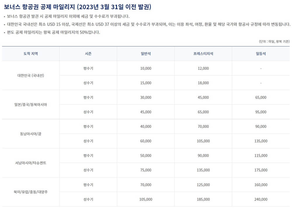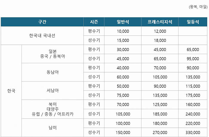 보너스 항공권이나 좌석 승진 시 국내/동북아/동남아/서남아/북미/남미 등 지역 그렇게까지 적용되던 마일리지 공제 기준을 운항 거리 기준으로 변경합니다.