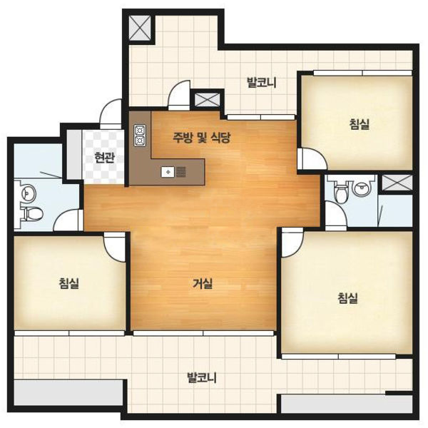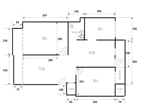아파트 기준 : 주방 침실, 거실, 화장실, 현관